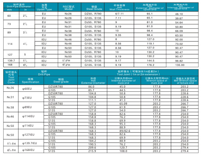 摩擦焊鉆桿及接頭執(zhí)行API / SPEC/5DP和 SY/T5561-2008標準,鉆桿現(xiàn)有DZ50、R780、 G105、S135鋼級,均經(jīng)過局部或整體熱處理, 機械性能滿足標準要求;接頭采用優(yōu)良的合金鋼35CrM。、4137H等調(diào)質(zhì)處理,螺紋由數(shù)控車床、成型刀具加工,表面鍍銅或磷化處理,防粘扣性能良好。也可根據(jù)客戶要求定制生產(chǎn)。
